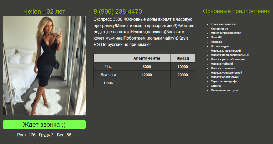 Написал как есть, не каких эмоций, всё нормально прошло, есть сейчас с чем сравнивать и понимаю что сколько стоит. Я не написал, что там всё ужасно, просто не должны услуги за 6000 так и в таких условиях оказываться по Ярославским меркам ( это моё мнение). Для 40 лет не плохо выглядит, высокая, стройная блондинка, грудь где то 2, подвисает. Ноги стройные, жопа худая, кожа нормальная, если и рожала особых последствий нет, ухоженности особой нет, просто следит за собой, возможно спортом занималась. Указанных ласк и поцелуев нет, повторюсь, всё скованно, скорей всего анкету ушлая подруга составляла, а сама Hellen в ней и половины названий не понимает, особенно про массажи. А лучше сами навестите её, тогда и пообсуждаем, только на экспресс, час за 6000 там нечего делать.