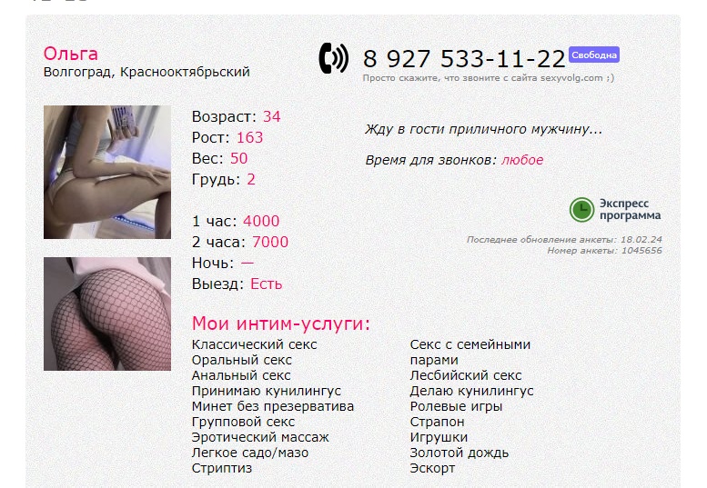 Вот такая анкета попалась https://sex1.sexyvol...ka/104565шесть/ Краснооктябрьский р-он.