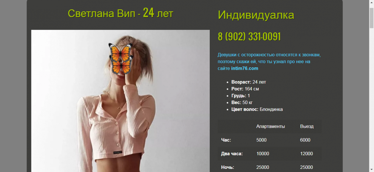Думаю какой то шалманчик , анкета появляется вместе с другими похожими с ценой 5-6 т. типа этих: https://berry.intim76.com/girls/5178 , https://berry.intim76.com/girls/5346 , https://berry.intim76.com/girls/5621 и прочих , в каких то анкетах указан только выезд в каких то и апартаменты но не хрена , звонил по номеру в анкете где есть апартаменты , ответила какая то тётка, сказала - У нас только выезд.