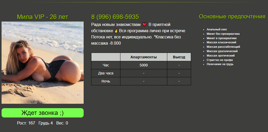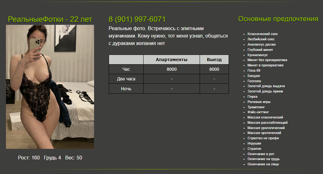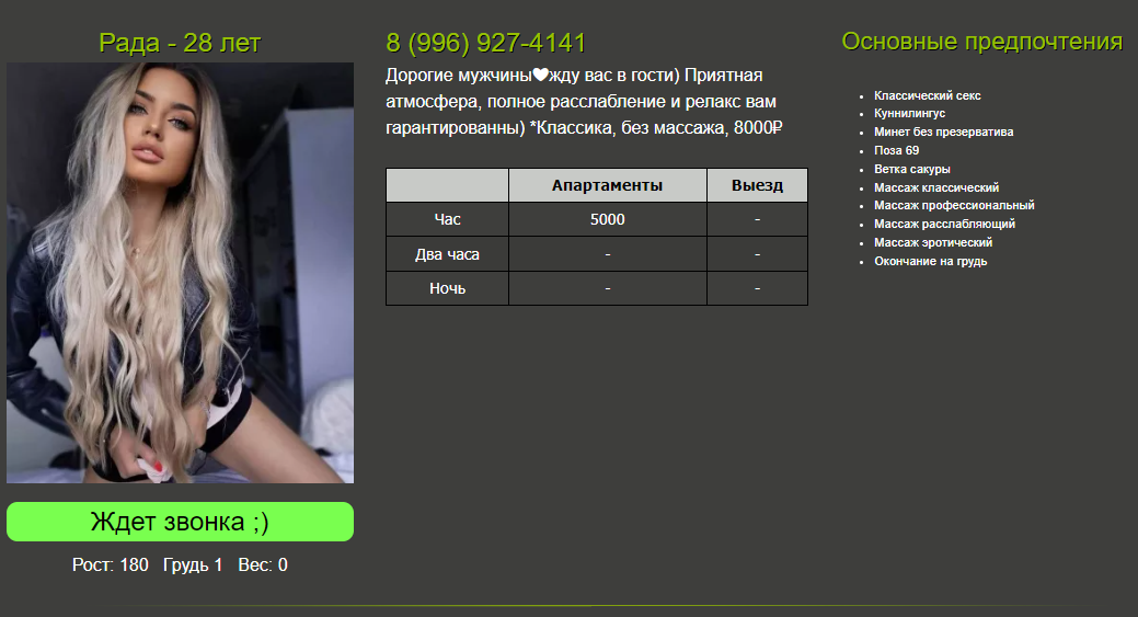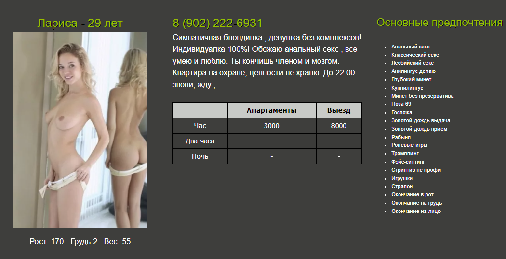 КС. В принципе не плохо, наездницей попрыгала, все очень плотно, смазка натуральная, но не дотягивает полной удовлетворенности. Повторюсь, на столько миниатюрная, иногда казалось, слегка обними и рассыпится в руках. Для сравнения сходить можно, скоротать время и слегка размяться. Всяко лучше чем, как писал коллега, когда как котенка погладят, назвав массажем. Для разнообразия и пополнения коллекции можно посетить.https://popki.intim76.com/girls/726;