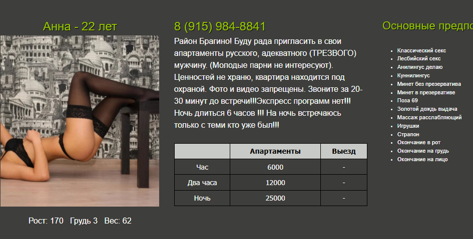 Полине 25 лет - 915-967-80-97 набирал недавно, встреча не состоялась, сказала, что сегодня уже не может, принимает не больше двух клиентов за день, встречается в своё удовольствие нечасто и всё такое. Чешет сексуально как по написанному ( привстал даже как в вашем случае ) ещё раз звонить не пробовал , или её анкеты нет или мне не как. Хорошо если это она сама по телефону так общается но сомнения появились, что диспетчерша . Раньше у массажисток диспетчерша похоже сексуально общалась если не мёртвого то полудохлого точно уболтала бы.