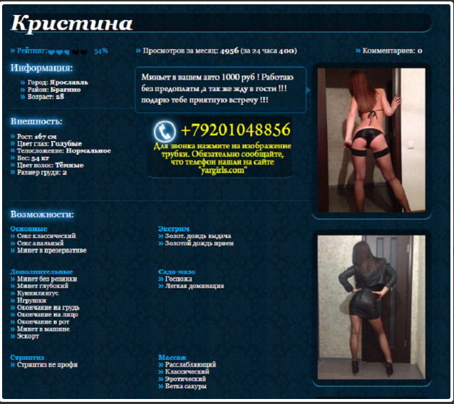 По второй не точно но думаю одна из множества анкет дорогообьёбищьного шалмана. Думал потратиться но всё же проверить что там и как но потом желание пропало. Деваха одна просто рассказала , работала там. Чья контора не знает, есть две квартиры в районе Московского пр. , Созваниваются с диспетчерами и выходят на смену (одна диспетчерша вроде тварь конченная , на девок орёт за людей не считает), в смене девах несколько , обычные девахи фотки в анкетах понятно все левые но их и не заботит по каким анкетам работают. Принимают и на хате но чаще сауны и гостиницы, в основном клиенты приезжие , туристы и свошники. 50 % заработка конторе + 1000 за хату и анкеты.