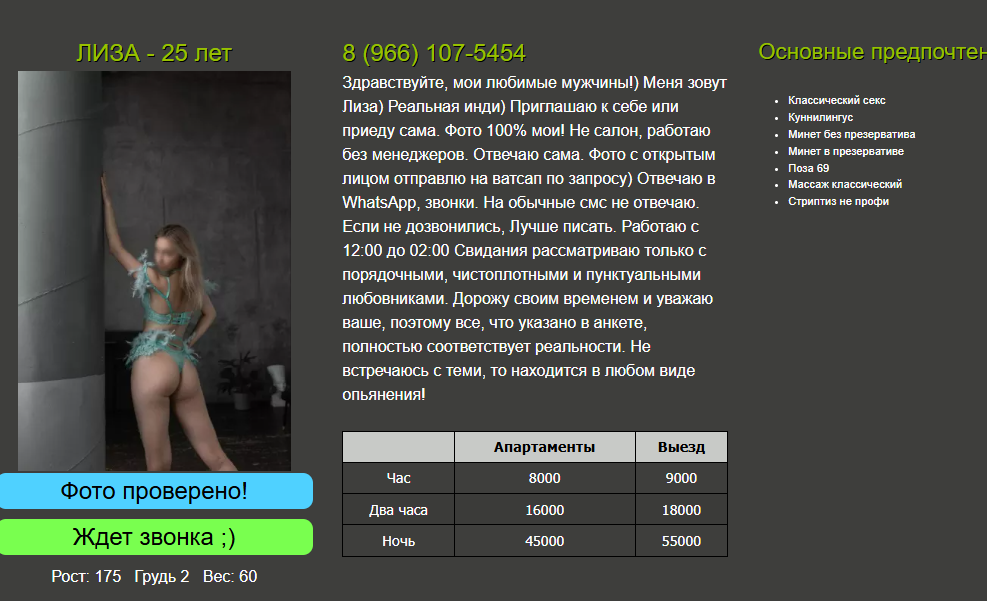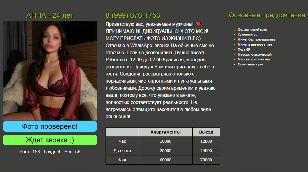 . Прошмыгнул, поднялся на этаж, встречает. Фотки не ее, я повелся на фигуру, а там явные несоответствия. Возраст 35-36, рост 170, грудь 3 подвисает, вес 60, есть животик, стремные не свежие татухи (опять же, на фото их нет), плюс-минус худая мягкая попа. Если честно, я таких девушек называю «бесформенные», пропорции тела очень странные, не красивые. На лицо не крокодил, пахнет приятно, молодец.