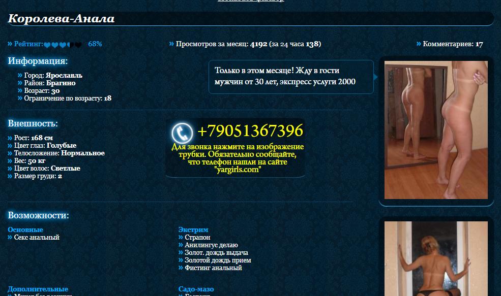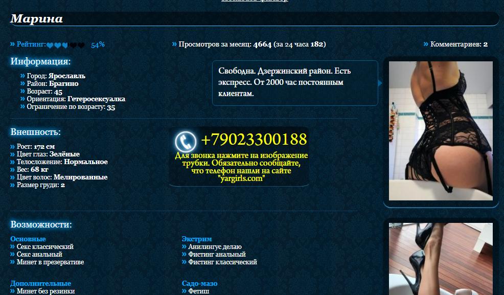 Был у нее постоянником года полтора назад! Цена была 2000 с первого раза. Ощущения самые прекрасные. Очень необычная барышня. Разговаривает на Вы даже в постели. Фигура хорошая для 40+. Видно, что секс ей нравиться. Позы любые, МБР прекрасен, попа табу, но анилингус любит и делает. Пару раз встречался в формате ЖМЖ, 3000 т.р., подруга тоже хороша, но чуть покрупнее. Лесби не было. Поток у нее был всегда, несмотря на то, что принимает в Брагино на Урицкого. Видимо поэтому ценник поднялся. Не давно звонил ей несколько раз, трубку не взяла. Думаю, что постоянников слишком много стало