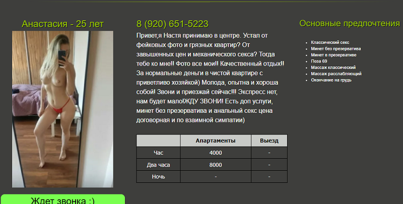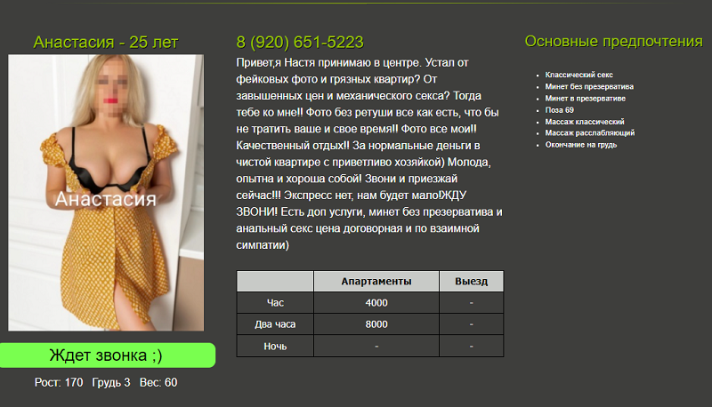 Анастасия 25 лет тел. 920-651-52-23 , 4000 р.