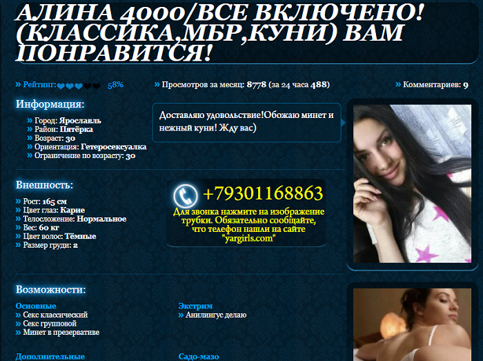 Фото в анкетах постоянно меняет и пишет фото мои, чушь нет не одной её реальной фотографии. Светловолосая, лицо обычное. Не общительная и мало разговорчивая, среднего роста, полноватая, живот есть, за фигурой не очень следит, грудь не плохая, упругая. Если в бытовом сервисе вроде не плохо, то в интимном полный "0". Допов нет, миня в презике дилетантский какой то, одно поверхностное мусольканье. И КС не лучше калибр средний, смазка своя и использует, эмоций ни каких. Тупая долбёжка, кукла из той анкеты наверно поактивней будет. В общем закончил, сполоснулся и ушёл, она по моему была рада, столь быстрому завершению процесса. А в анкетах чего понаписано, всё херня. И сравнивать, говорите Алина не стОит 4000 руб. , то эта тогда сколько стоит ? Откуда она такую цену на свои услуги наковыряла?