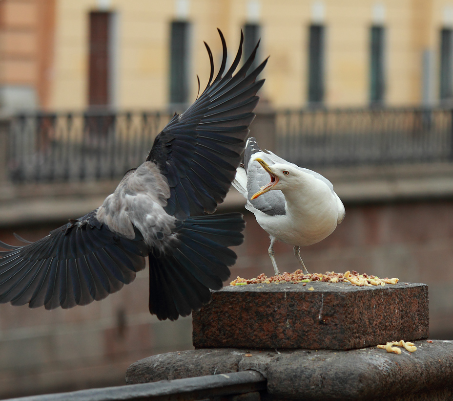Кстати, как мне сказала одна знакомая биолог, голуби внизу пищевой цепочки по отношению и к воронам, и к чайкам.