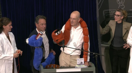 Получив награду от нобелевского лауреата 2007 года в сфере экономики Эрика Маскина, шнобелиаты наглядно рассказали о своей работе. Для этого они устроили целое кукольное представление с участием двух плюшевых червей, оранжевого и синего.