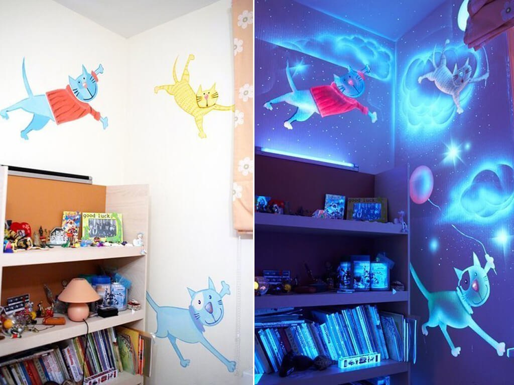 Хочу вот так, но не хватает уверенности в том насколько это безопасно в интерьере где есть дети. Хочу именно люминесцентную краску, чтобы при дневном освещении не было видно. Есть ещё флуорисцентная, но это не то. Ну так вот. Комната использования столовая, она же игровая и самые большие детские развлекухи стоят там.