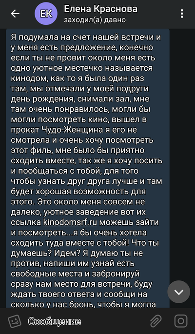 Всем привет. Не знаю может для многих не актуально, но все же. На сайтах типо лав планет,куямба и тому подобные. С тобой связывается девушка типо понравился или ещё как. Чаще наверно с ними связываются. И вот вы такие мило общаетесь может даже дней 5 и тут бац она тебе говорит пошли в кино,только не обычное, а в зал для двоих романтика и шпили вили на мягких диванчиках. А у неё как раз подруга работает в одном из таких и даёт тебе ссылку https://kin0d0msrf.ru/ Ты такой радостный летишь на сайт заказываешь диванчики, а работают они только по авансу. Дальше я думаю всем понятно, что ни дамы ни кино тебе не удастся увидеть. Креплю картинку с похожим сообщением,но варианты разные,сайт как я понял пока один