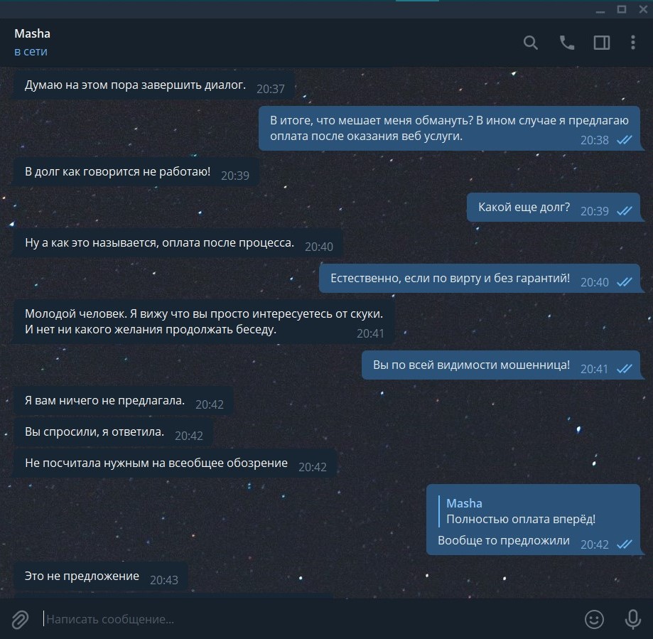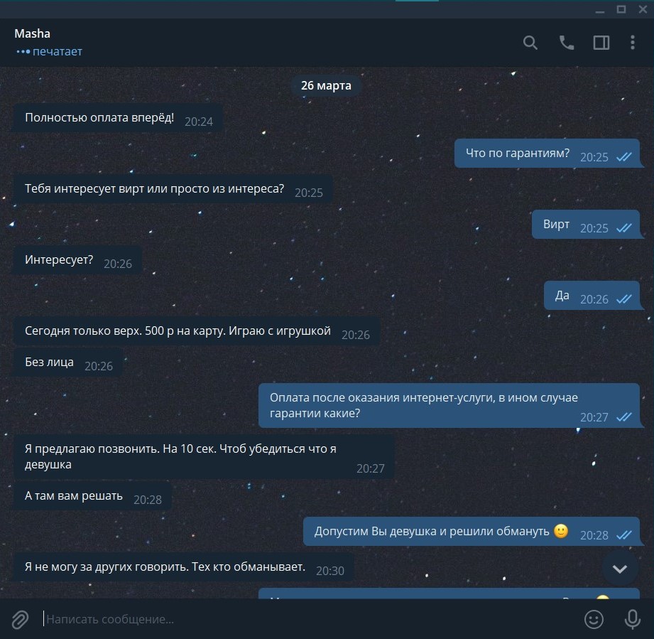 Да ладно ко, доказан абсолютно. Быть анонимными и прибывать в интернете - не дает исполнителю "мычать" на счет гарантий, клиенты не обязаны придумывать/додумывать безопасный метод расчетных операций, исполнителю в таком случае необходимо предложить варианты, которые клиент может рассмотреть и исполнитель ничего не теряет, показать себя обнаженную - это не работа, в общедоступном понимании, иные оправдания о "потери времени" - притянутое за уши никчемное оправдание. Третья сторона в виде платежного оператора - считаю так себе аргумент, а конкретно но о чем, в интернете большинство покупает наложенным платежом, ну может на таких сайтах как Wildberries можно сделать, потому, что это торговый гигант и ему спокойно можно предъявить, репутация какого то оператора - не влияет на мошенников, деньги выводят с ЮMoney, qiwi кошелек, PayPal, DonationAlerts, с банковских счетов и не найти потом концов, предоплата физ. лицу или еще куда то, не по официальному счету (с печатью и подписью) - юридически является подарком, Вы конечно же можете заявить в органы, что Вас вебкам модель кинула и попытаться отсудить, может условно судья признает это как "неосновательное обогащение", только в результате будет ПШИК, верить можно только в церкви и в подобных религиозных заведениях, я представляю Ваше лицо, когда после "вперед" - кинут