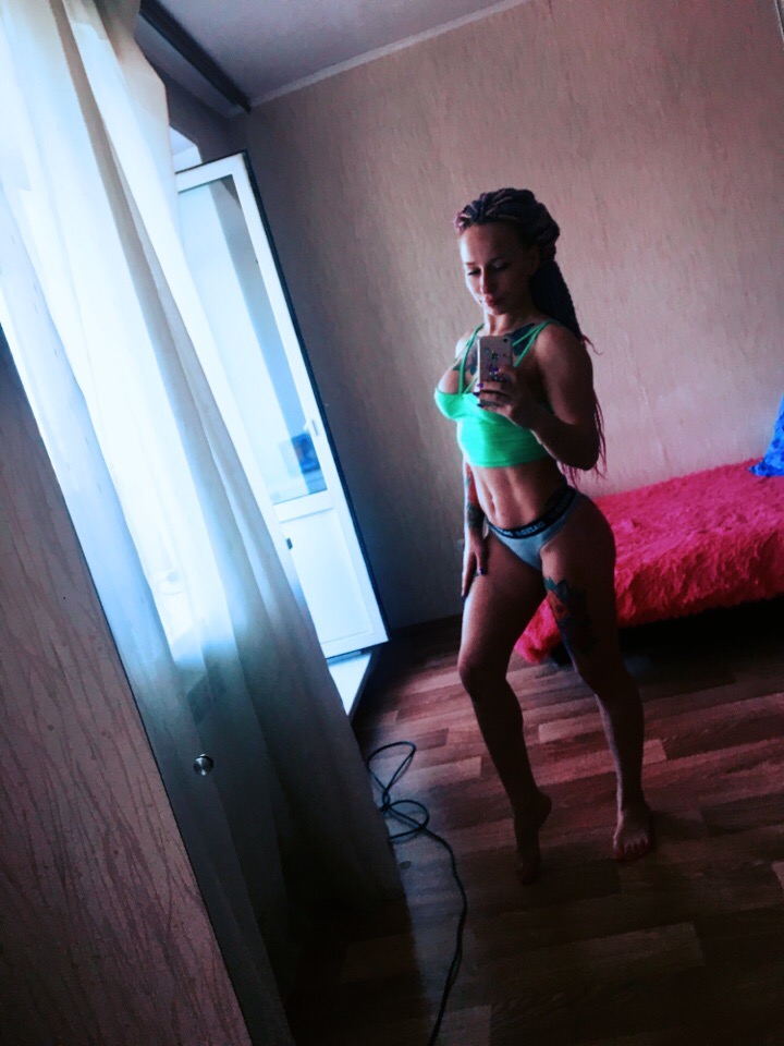 Встретила меня Алёна в шортиках и спортивной маечке (вроде бы), я просто в тот момент был поглощен осмотром ее внешности, лица и фигуры... Лицо приятное, пирсинг на нижней губе и по бокам не портит вид, но придает какую-то оригнальность лицу и в то же время вполне гармонично вписывается в ее общий стиль ! Волосы светлые, нарощенные искусственными дредами (цветными !)), длинные, почти до пояса, что выглядит необычно (для меня например) но тем не менее опять же повторюсь - оригинально и смотриться красиво на самом деле...))