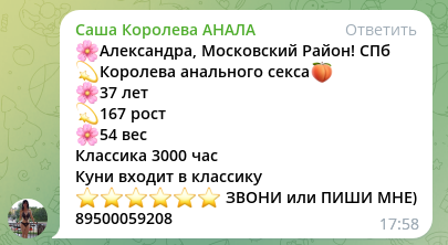 Какая то чисто фотографическая история приключилась. Гуляя по просторам сети, давно уже заприметил анкетку и фотографии меня как то шибко зацепили, хотя типаж не совсем мой, сиськи двойка и чувствуется над ними поработал фотожопер, а на самом деле там два кожаных мешочка и тем не менее все равно свербитъ и тянетъ. Сегодня же утречком решил реализовать свои вожделенчики на практике, неча на фотки попусту пялиться. Позвонил, трубку поднял какой то недовольный, сонный голос, спрашиваю - а Саша нынче на месте? На том конце сразу же произошла какая то волшебная метаморфоза, голос мгновенно ожил и стал сексуально мурлыкающим, не иначе во мне усмотрели праздношатающегося по Санкт-Петербургу Брэда Пита - Да, Саша это я и буду ждать тебя! От одного только разговора чуть не обкончался и, собственно, можно было бы уже не ехать за сим, но, все таки, поспешил выдвинуться. Приехал. Позиционирован правильно. Дверь открыла молодая Админ, такая вся упругий колобок, дала тапки, проводила в комнату и сказав - сейчас приглашу Оксану; оставила меня. Комната весьма просторная, добротная, окно большое, раскрыто на распашку за сим в помещении было как на улице и гулял ветерок, ладно, будем считать это как воздушное охлаждение. Заходит Александра в прозрачно черном пеньюаре, улыбаясь и осторожно глядя на меня сверкающими глазками. - УХ ТЫ!! Непроизвольно вырвалось у меня, на меня шла ожившая фотография. Сходство 100%, я бы сказал 146% если бы не уставшие сиськи, но к этому был готов и психологические фильтры уже работали. Вот так вот встретились как после долгой разлуки, сходу объятия и поцелуи. Не знаю сколько мы так простояли я уже был готов и весь дрожал, но в голову резануло мыслью - Время и Деньги!!! Взял себя в руки, отстранился, дал денег - Господи, Божеш мой! Полотенечко мне принесешь? - Ах, да, конечно, сей час!! - я могу уже раздеваться? - об чем речь? Конечно! Покидал одёжи в кресло и побёг в душ. Санузел совместный, весьма просторный, запирается изнутри на крючок, без идиотских душевых кабинок, а с нормальной ванной, все в наличии, все чисто, все функционирует. Вернулся в комнату, дева уже все расстелила и сама попросилась в ванную. Ждал не долго, дева вошла, мы схлеснулись и больше уже не разъединялись, ну кроме как для смены презервативов, пока админ не затарабанила нервно в дверь. Ну да, всё правильно, иначе мы бы просто поубивали друг друга, мокрые как мыши от пота, было жарко и раскрытое окно не спасало. Расстались с большим трудом, но труба зовет, оделся и откланялся, грозно пригрозив обязательно ещё вернуться. Дева подстраивается великолепно, кажется, что мысли читает, целуется беззаветно, камасутра нервно курит в сторонке, и может это делать хоть целый час, активно, но ненавязчиво. Не на чем не настаивает, но и не лежит бревном, такое активное подчинение. Технически просто идеальна и ни секунду не оставляет без внимания. За минет ничего сказать не могу, не было его, за совершенной его ненадобностью.