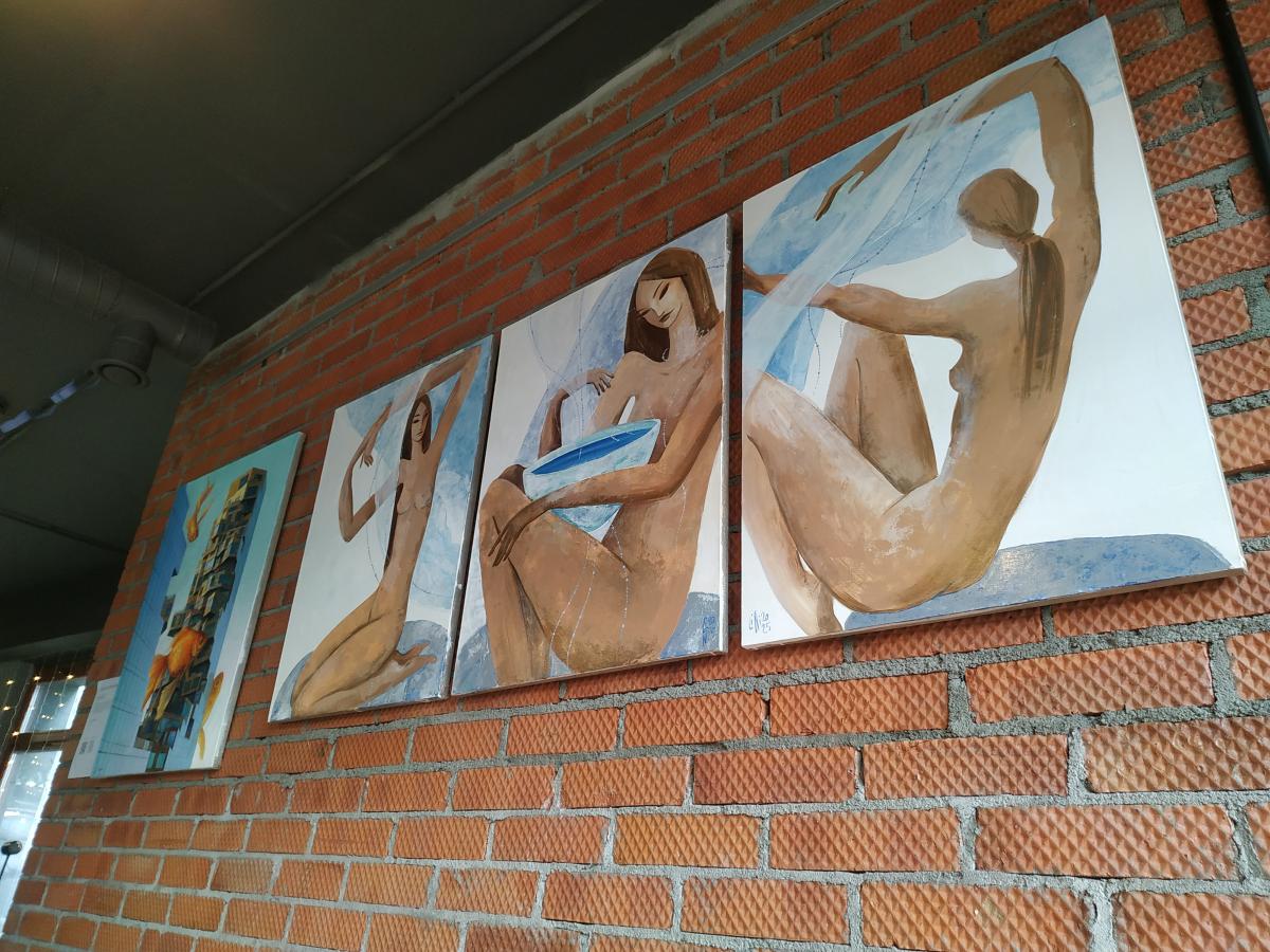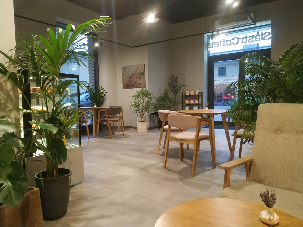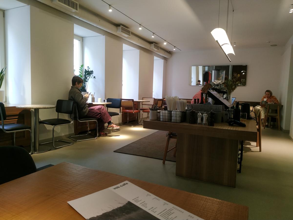 Сам зал метров 35, минималистичный дизайн, 9 столов вдоль стен, один большой длинный общий с кассой -посередине. С/у похож на примерочную- много света, большие зеркала, всё белое и светящееся.