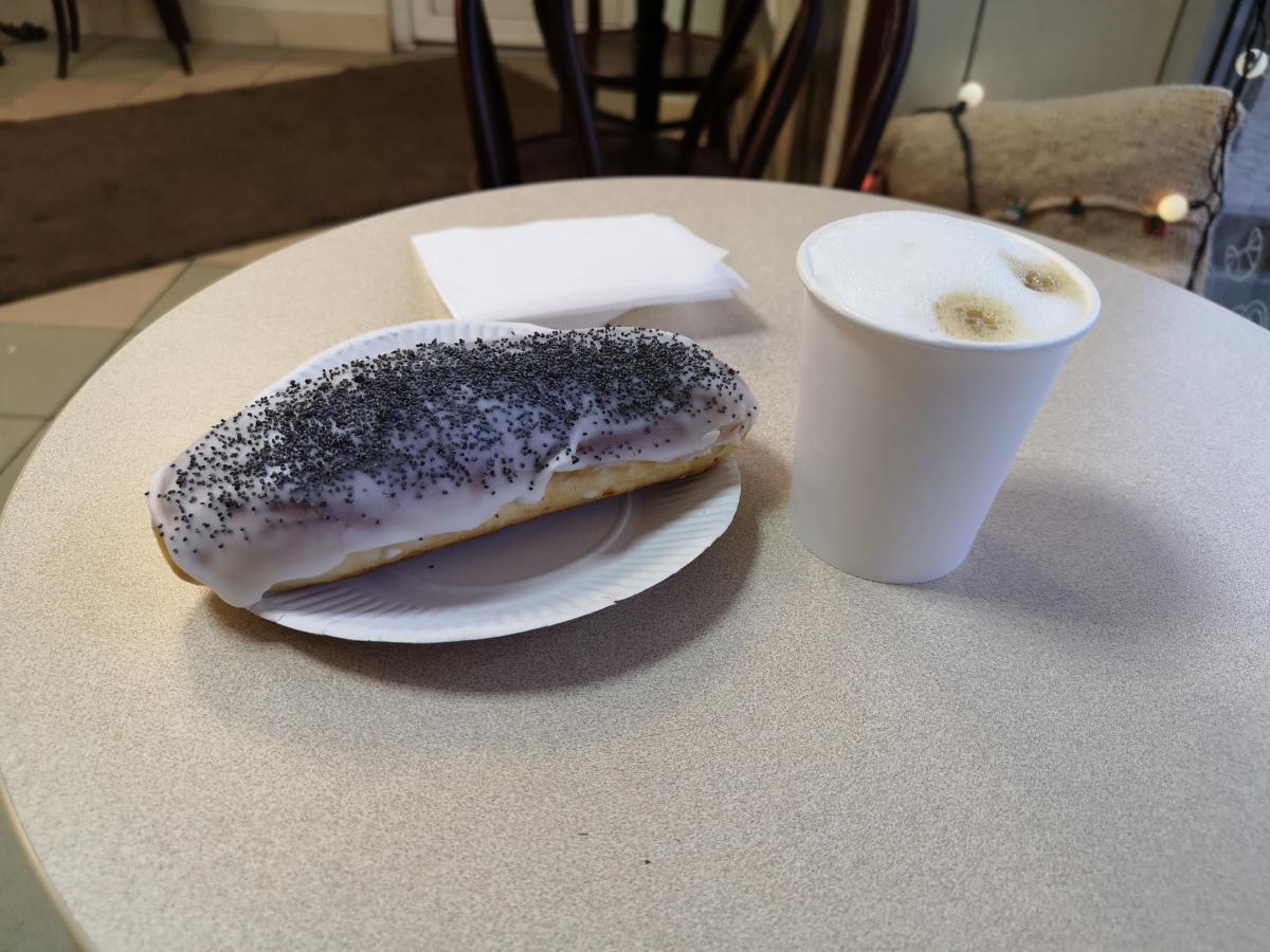 К недостаткам отнесу антураж. Прохладно, поэтому все сидят в куртках. Бумажные тарелочки, картонные стаканчики, дешевая кофемашина. Иногда - очередь мамаш с детьми и бабок за хлебом.