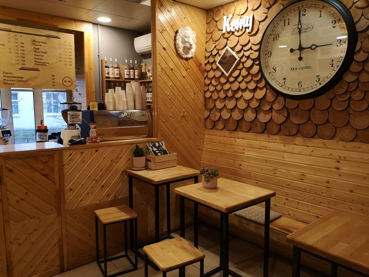 Помещение очень маленькое, но приятно оформленное светлым деревом. Кроме стойки, поместилось 3 двухместных столика и стеллаж с образцами кофе. Конечно, заточено больше на вынос.