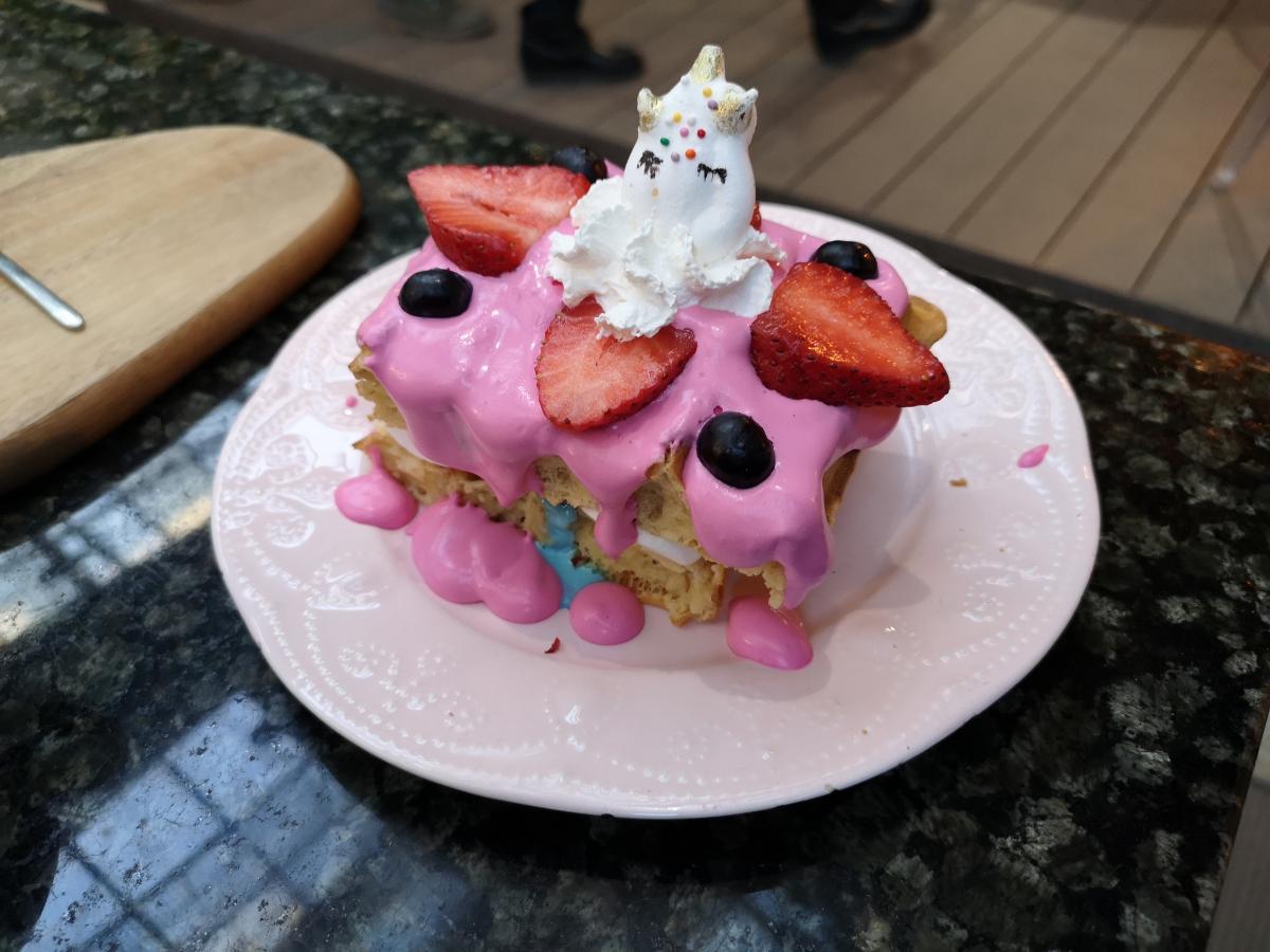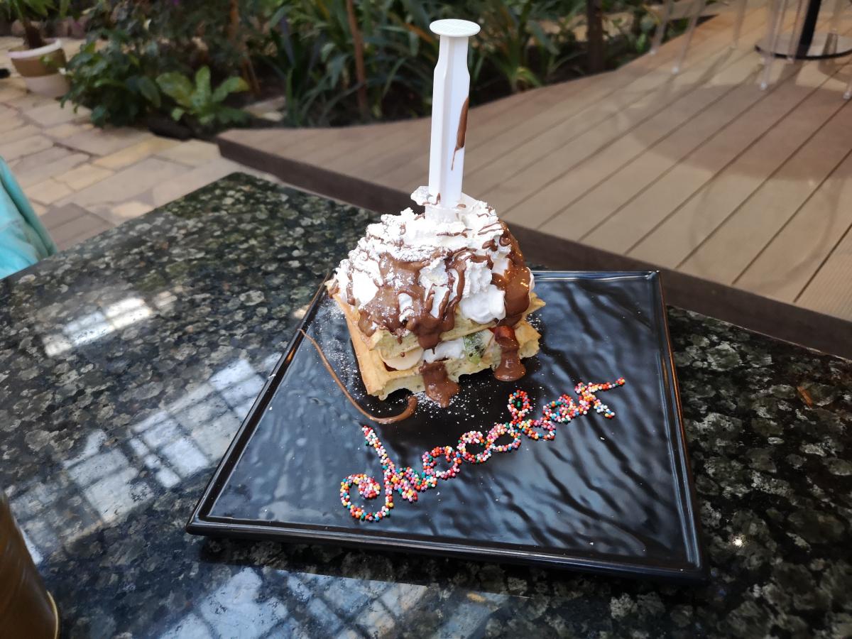 Брали бельгийские вафли, они вкусные, но не понравилась подача. Каждая вафля разрезана пополам и положена в 2 слоя с прослойками мороженого, крема и др. ингредиентов. В процессе еды все расползается.