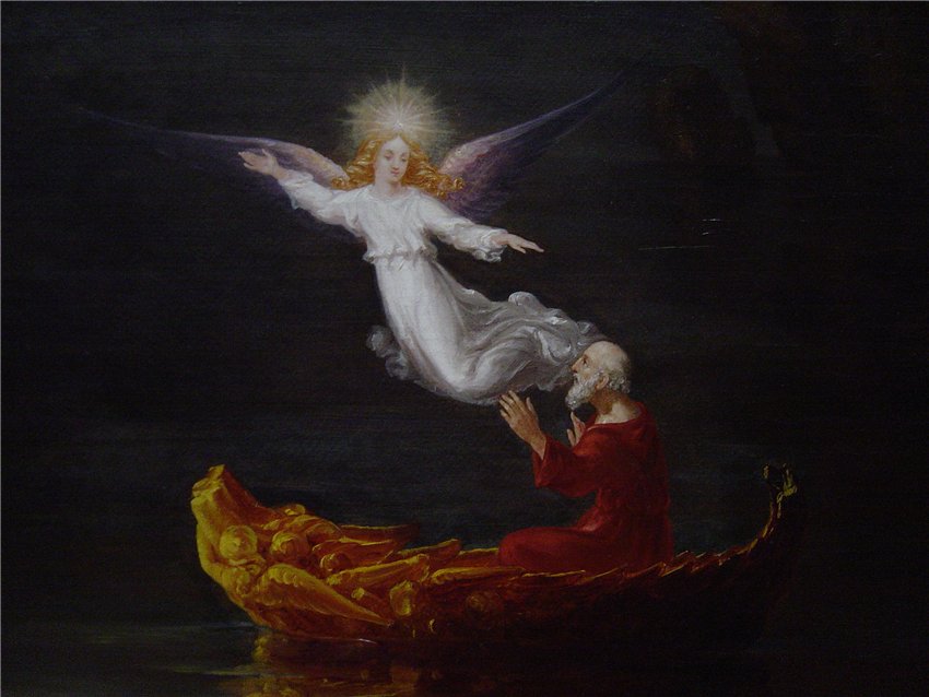 Единственный луч света в темном царстве спускается к старику через просвет в тучах, и в нем виднеются мелкие крылатые фигуры. Наверное, встречающие героя души покойных родственников?
