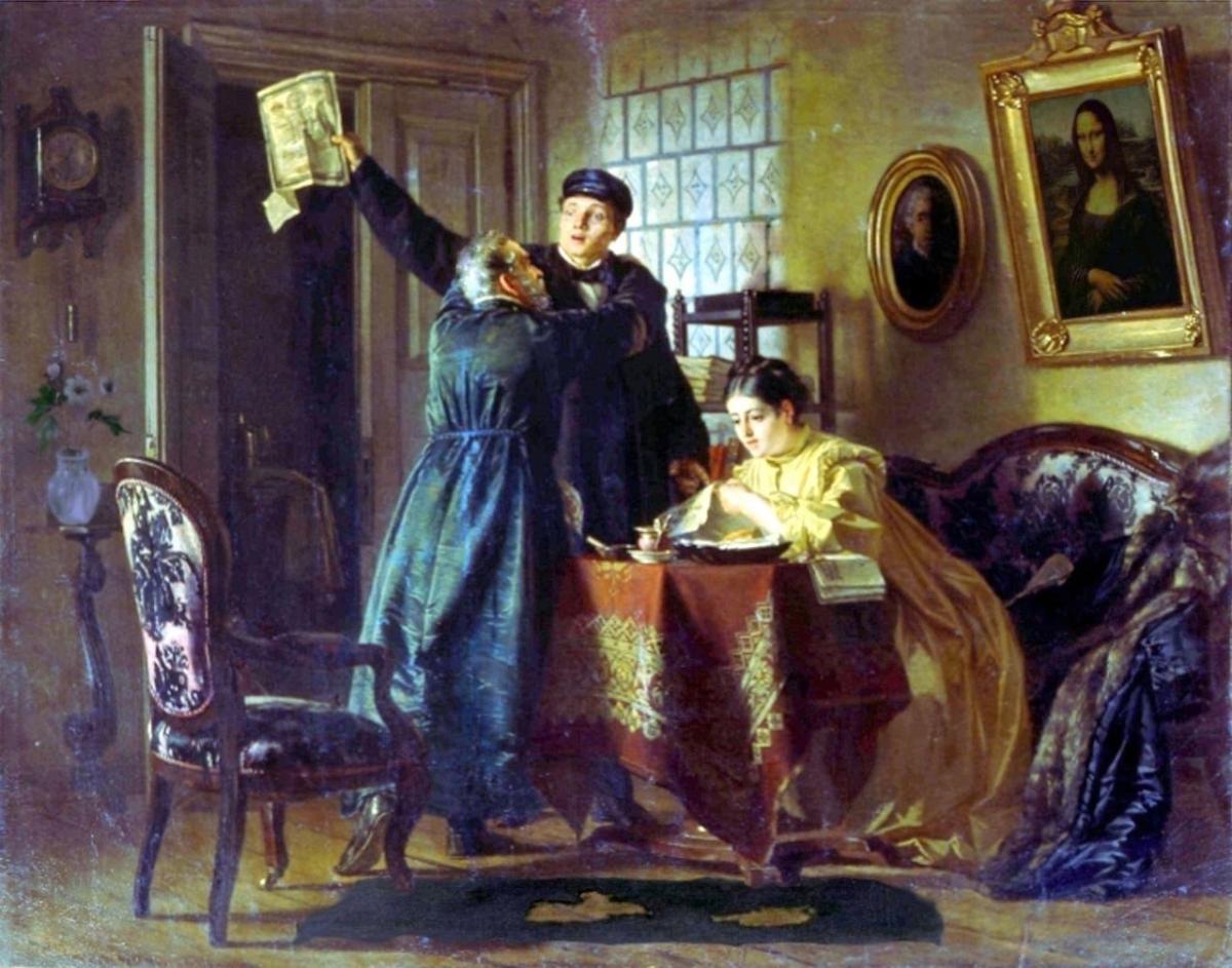 Картина Неврева была очень популярной среди современников и неоднократно печаталась в различных изданиях и на открытках. Примечательно, что в журнале «Всемирная иллюстрация» № 383 за 1876 года, на репродукции картины заменили портрет Мона Лизы другим портретом.