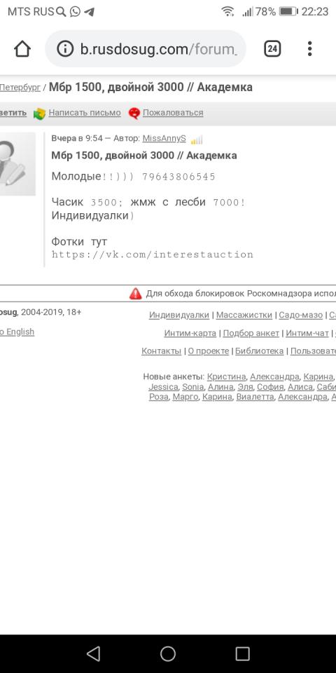 ТТХ соответствуют. Товарищ "Hund", вестимо, был именно у нее. Тело очень приятное, упругое, кому-то может показаться плотной, как по мне - в самый раз. Таз приятно широкий, сверху вид просто идеальный. Кожа очень белая, приятная, волосы длинные, светло-русые либо блонд, выглядят натуральными. Целуется, кунится. Показалась скромной домашней девушкой, но я сам скромный, может, из-за этого. Есть котишка, милый. По процессу - старается, окрестности, язычком уздечку стимулирует, подмахивает. Презервативы нормально надевает, может, научилась с последнего отзыва? Прайс такой же, 3.5к/ч с МБР. В целом, мне понравилось. Но в виду небольшого опыта, последнее слово оставляю за более прошаренными ходоками