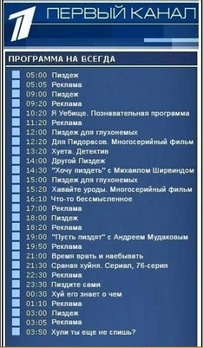 А если представить себе телевизионный канал для нормальных взрослых мужиков. Или хотя бы канал на Ютубе. Какой должна быть сетка такого гипотетического "Муж-ТВ"?