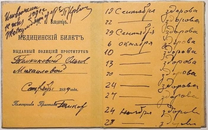 Надо сказать, что российское государство образца XIX века во многих вопросах оказалось гораздо более продвинутым, чем современная Россия. Например, с 1843 года была узаконена проституция. Конечно дело не в том, что правительство поддерживало сексуальную революцию, просто назрела необходимость хоть как-то остановить распространение сифилиса и венерических заболеваний. У дам, торгующих собой, были отобраны паспорта, а вместо них выданы знаменитые желтые билеты, они должны были регулярно посещать врача и вообще исполнять все правила, предписанные законом. Бордели в Петербурге предоставляли свои услуги клиентам с самым разным достатком. Великолепные красавицы в шикарных апартаментах обслуживали состоятельных посетителей, бордели попроще встречали младших офицеров, студентов, людей свободных профессий, совсем уж непритязательные дома терпимости ждали в гости фабричных рабочих. В Вяземской лавре работали проститутки самого низшего пошиба. Полицейские облавы случались редко, соответственно, и необходимости получать желтый билет не было, а значит, не нужно было и посещать врача. Если знаменитые петербургские камелии встречали любовников, укутавшись в шелка, то здесь товарки Сонечки Мармеладовой иногда прикрывали наготу только грязноватым полотенцем. Проститутками с Сенной становились едва подросшие девочки-бродяжки, дочери опустившихся жителей Вяземской лавры. Были и бывшие «работницы» самых дорогих борделей, готовые к торговле собой за копейки: алкоголизм и многочисленные болезни за несколько лет способны превратить цветущую девушку в старуху. Благодаря мемуарам Николая Свешникова мы знаем имя одной такой страдалицы, обитательницы трущоб. Саша Столбовая, по прозвищу Пробка, выглядевшая то ли на 40, то ли на 60 лет, грязная, вечно пьяная, с выбитым глазом и изуродованным побоями лицом, работала с молодости в Малиннике, потом просто в переулках, а после побиралась у торговцев на Сенной. Ей из жалости бросали объедки: селедочные хвосты, обрубки, гнилые овощи — она собирала все это и распродавала среди обитателей Вяземской лавры, тем и жила.