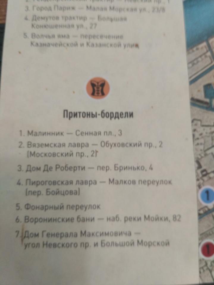 Мой скучающий взор привлек разноцветный листик. Читаю: «Карта Бандитский Петербург ХIХ век» Так интересно. Опа, подзаголовок: «Притоны-Бордели». Здесь знаменитый «Малинник» на Сенной площади. Воронинские бани, не знал, что там был бордель.