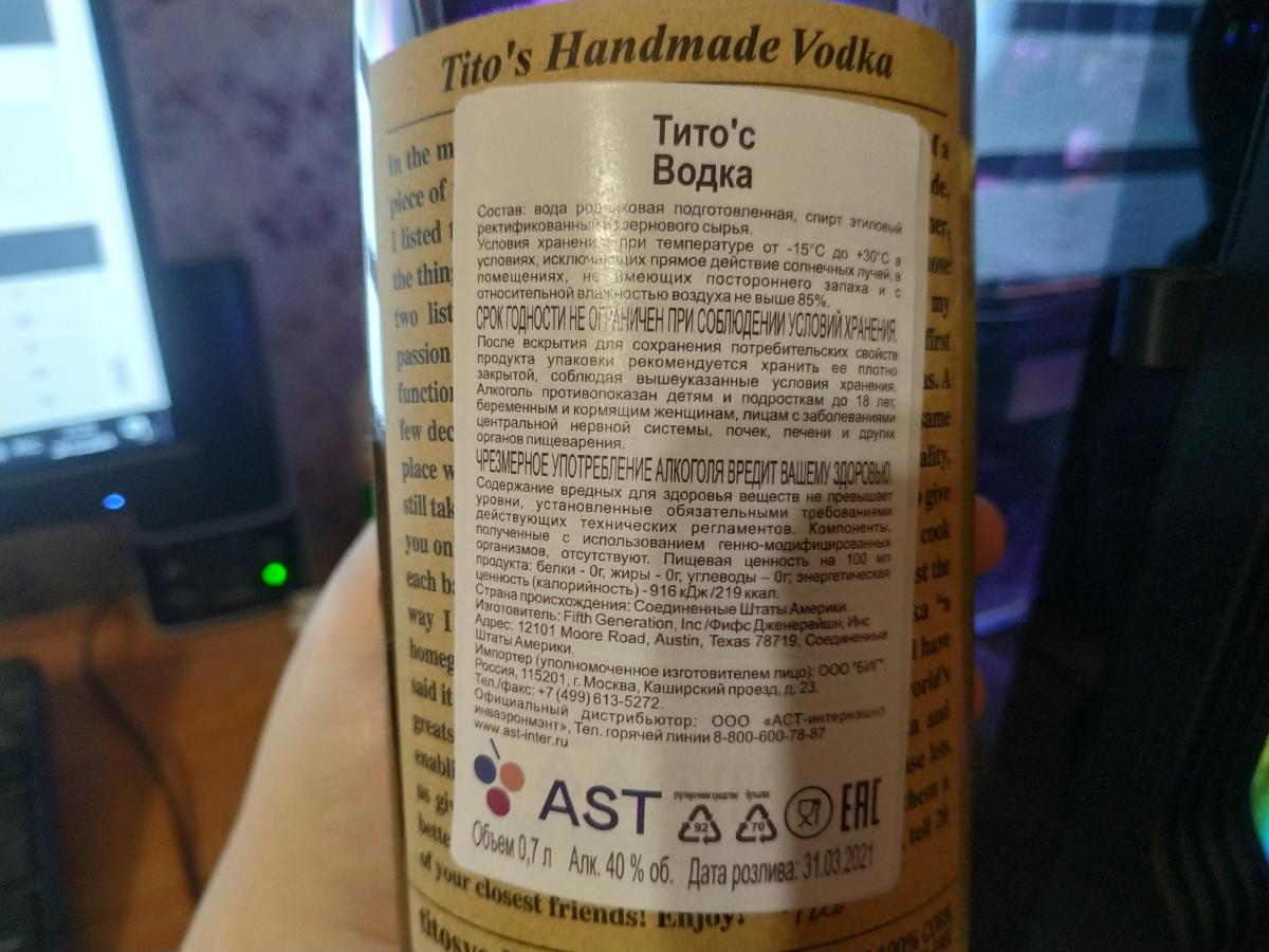 Что же испил под свои невообразимые том-ямоваые труды. Стояла с июня. Tito's Handmade vodka, берёная в "Напитках мира" за 1900р/0.7. Это не подарочный экземпляр, водка как она есть. Скажем так - бессмысленные понты. Если ты пацан 20 лет, и хочешь выебнуться, поставив вот это техасское из Остина (ебать-колотить!) на стол - то да. Если проделать такой фокус среди опытных алкоголиков - посмеются про себя и скажут, ебать ты молодец, уважуха на 50 лет фперёд... Оно конечно USA, Остин, Техас. Мягкая. Но. ------ Это ЕРУНДИСТИКА. Это дурость. Всё равно что выбрать для своего наслаждения только пизду, минуя очо и горло шлюхи! Знамо, что некоторые камрады, не могут по своим соображениям отделать шлюху до потери её сознания. Так есть же и другие методы, например порка.......