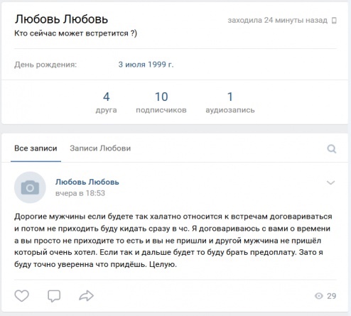 Если так посудить, сплошь и рядом такие ситуации: ты приехал, по телефону не отвечают; или в анкете одно фото, в реале - другая внешность; в анкете одна цена, по факту другую называют и прочее-прочее. Не думаю, что такие случаи нужно сюда сгружать. - Эта сфера услуг населению изобилует всякого рода моментами, не позволяющими клиенту всегда быть полностью удовлетворенным.