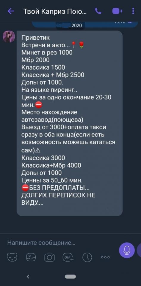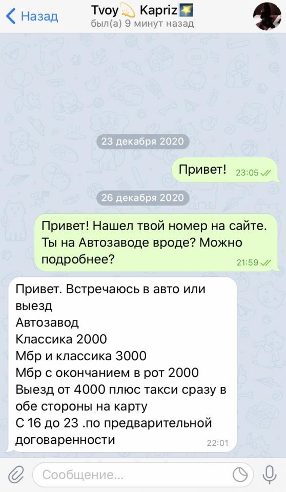 Сейчас же активно пиарится в телеге. И выводы неутешетельные: типичное автозаводское быдло с чсв, задранном до небес, оверпрайсом и даже нескрываемой склонностью к высокмерной лени. Типа, а чо я должна при мбр-е раздеваться? Нах, обойдутся (ага, это за 2к то). Но и это еще не весь пиздец. Пишет, что сейчас сделала пластику груди, и еще поднимет прайс, а чей-то резонный вопрос "как новые титьки улучшат стиль работы и отношение к клиенту?" царственно проигнорила. Наблюдаются признаки раздвоения личности и амнезии: на серьезных щах вещает на публику, что закончила академию МВД и имеет офицерское звание (ага, не иначе, как в свободное от работы в салоне время на лекции ходила), с кем-то усиралась в споре, что за 1000 никогда не сосала (но интернет вайбер помнит все).