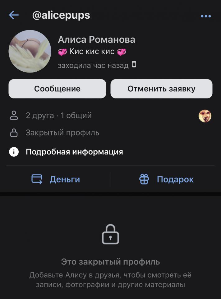 Нашёл данную особь женского пола в какой то из группы ВК, причём нашёл случайно, дева сильно не палит свою жизнь, поэтому ищет клиентов по Лайкам или на твой пост поставить лайк, или сама выбирает. Скрытность 80lvl.