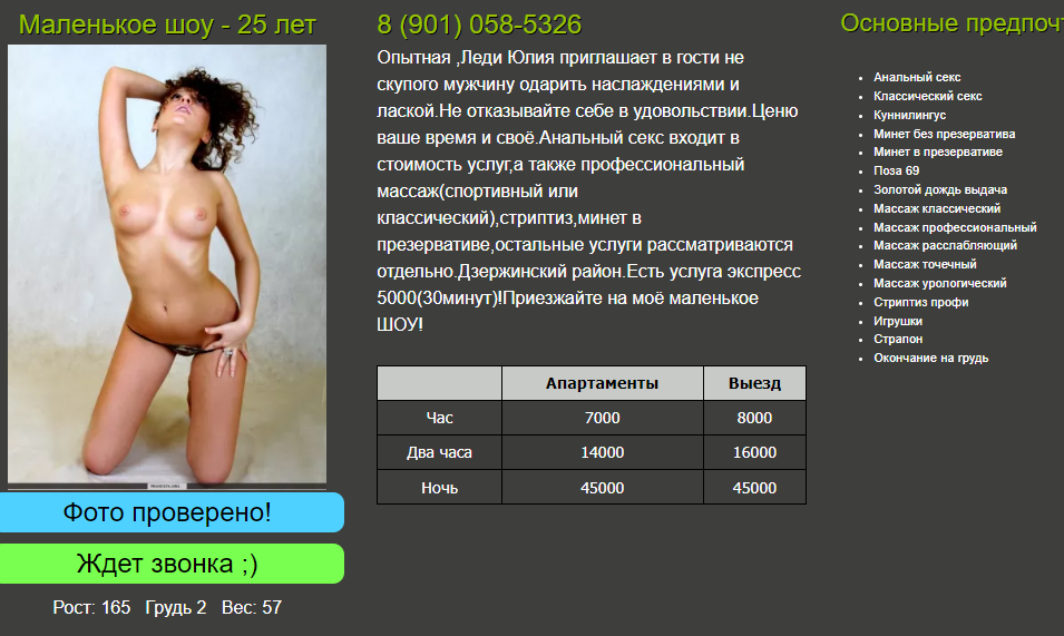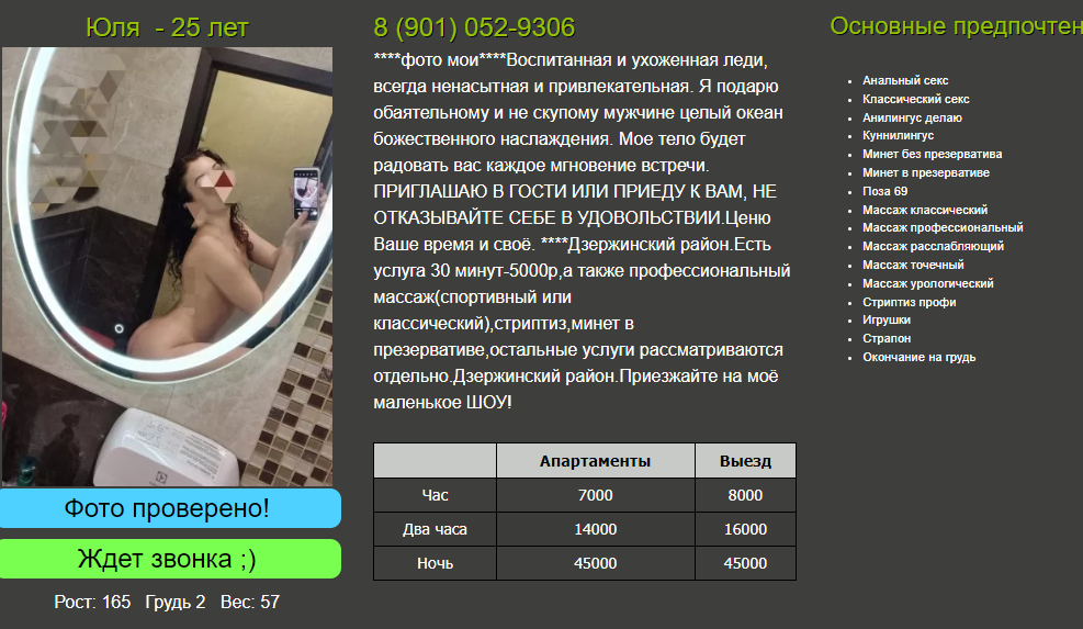 Теперь хочется сказать о позитивном. Самый лучший поход, Юленька Центр. Ранее Юля Брагино, Юля анальный секс. Наверное нет подходящих слов, чтобы описАть все происходящее во время встречи с ней. Это реально надо попробовать самому. Юля в бизнесе давно, только из-за высокого ценника не рассматривал ее анкету для посещения. Понимая, что время пролетает быстро и можно вообще потом не попасть, решил посетить деву. Созвонился без проблем. Принимает на Толбухина, место вцелом удобно расположено. Дом в хорошем состоянии, в квартире отличный ремонт. Встречает в секси наряде на каблуках. На вид около 30 лет, на лицо симпатичная. Прямо с порога очень располагает к себе. На выбор предлагает чай/кофе, конфеты, было впечатление, что готова вообще приготовить любую еду на заказ) Уровень общения запредельный. Иногда у феи думаешь как разговорить даму, тут же и думать не надо, говорит сама и обо всем. Можно даже особо не отвечать, беседа так или иначе сложится) Во время разговора прижимается, заигрывает. Спрашивает о предпочтениях, старается угодить во всем. Принимала за 8к, ценник и сейчас актуальный. Программа стандартная с массажем, стриптизом. Есть допы МБР и АС, но и без них можно получить ураган эмоций. В душе имеются антисептики. Программа начинается с танца у пилона. Виды при этом открываются потрясающие. Потом показывает умение пользования игрушками. А их у нее не мало! Не успеваешь заметить, как становишься сам участником процесса. Во время КС может облизать всего (буквально). Имеются такие опции как поцелуи, анилингус (у нас в городе есть вообще феи с такой услугой?) Трогать можно везде. Самое главное, ей самой все это дико нравится! Смазка своя, поза обратной наездницы с игрушкой в заднице это надо видеть. От такого заводного темперамента и безудержной страсти приплыть можно достаточно быстро. В этом только плюс. Не успеваешь опомнится как уже на втором заходе. Отдельно хочется сказать про массаж. Делает она его профессионально. Специальный массажный стол, не оставляет без внимания ни одного участка тела. После него ощущения непередаваемые. Время пролетает незаметно. Был точно больше часа. Замечаний на этот счет никаких не высказано. По итогу однозначно рекомендую к посещению. Даже не смотря на ценник. Год назад может это и было бы очень дорого, то сейчас расценки у всех инди немаленькие. Только такого сервиса как у Юли я ни у кого не встречал. Соотношение цена/качество считаю у нее на приемлемом уровне.
