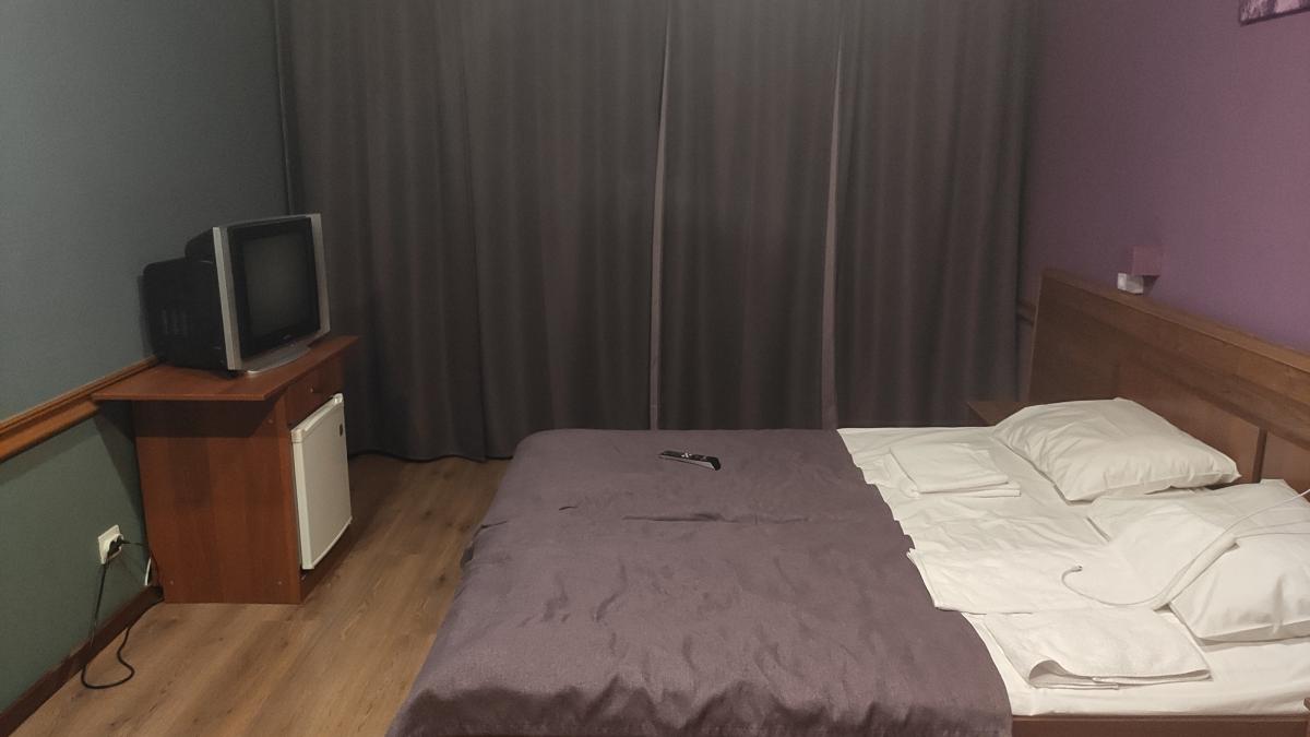 В номере:большая двуспальняя кровать,шкаф,телек,холодильник,шкаф,стол,два стула,тапки,два стакана,кувшин,4 полотенца,совмещённый санузел,шампунь,мыло и две шапочки для душа.Окна во двор.Чисто,но мрачно.