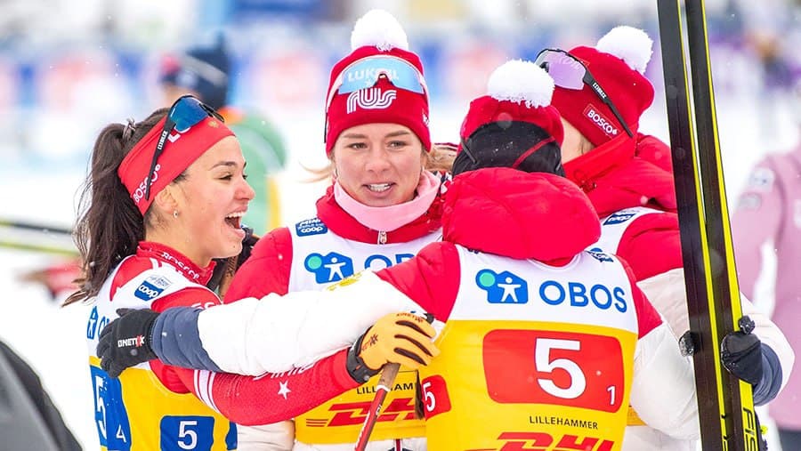 Всех с золотом в лыжной женской эстафете 4*5 км.