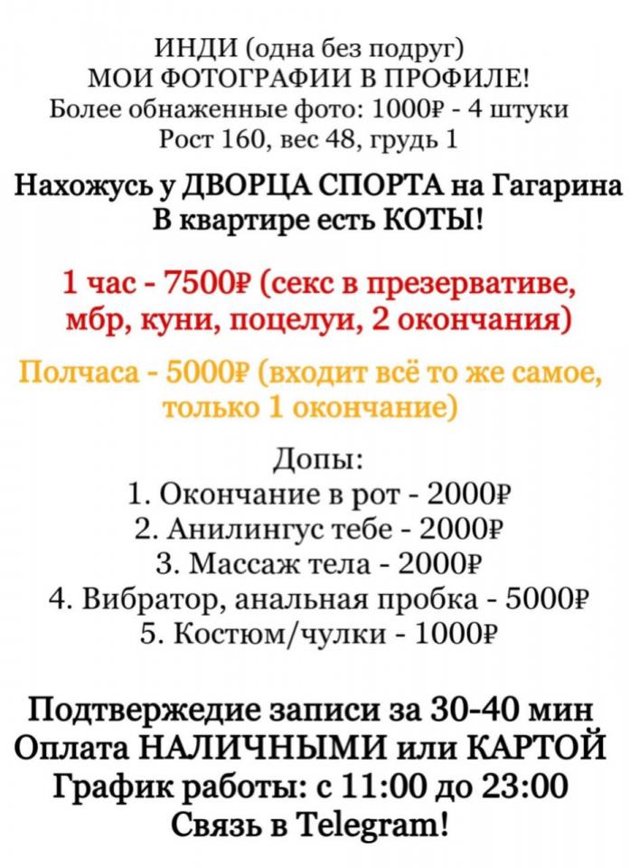 Принимает у Дворца Спорта. Ценник, кстати, вырос. Теперь от 7500р час (входят такие услуги как: секс в презервативе, мбр, куни, поцелуи, 2 окончания)