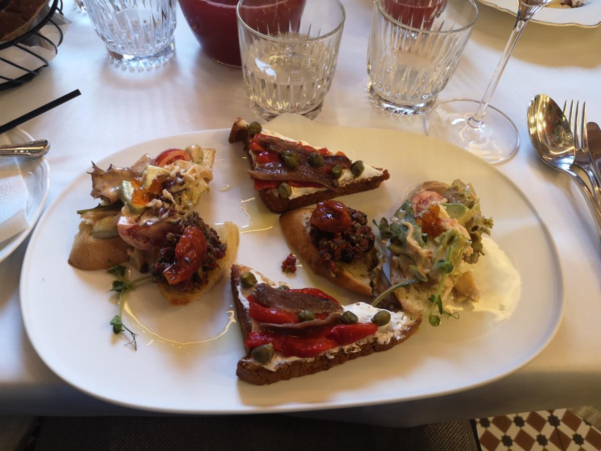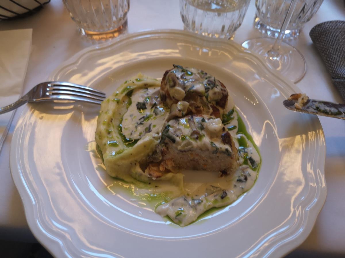 В таком ресторане нельзя было обойтись без классической французской кухни, поэтому взял луковый суп, а еще - ассорти брускет и котлеты из щуки и лосося. Поскольку во Франции никогда не был, не могу сравнить вкус с парижскими ресторанами, но мне все понравилось. Даже кофе был приличный.