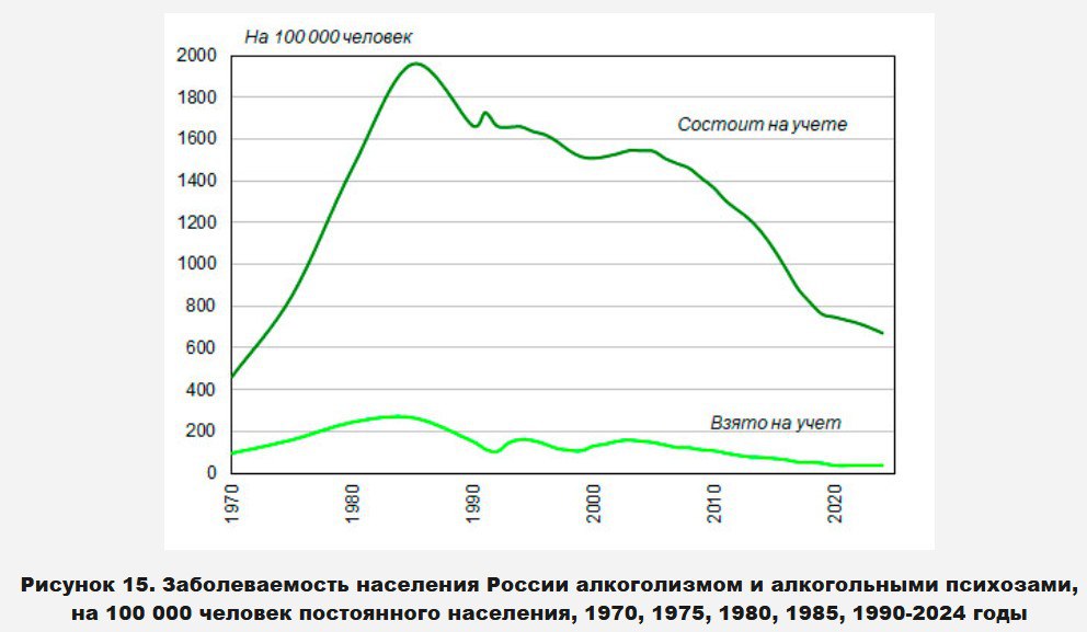 На графике видно, как спивался поздний СССР. К середине 1980-х на учёте в РСФСР (не в СССР, а в границах России) состояло 2,8 млн хронических алкоголиков. Если отбросить детей, глубоких стариков, значительную часть женщин, то среди мужчин алко-хроником (с психозами, «белой горячкой» и т.п.) был каждый десятый мужчина. Если бы и после 1985 года продолжился тренд, страна превратилась бы в территорию «белой горячки», а значительная часть мужчин была бы недееспособной.