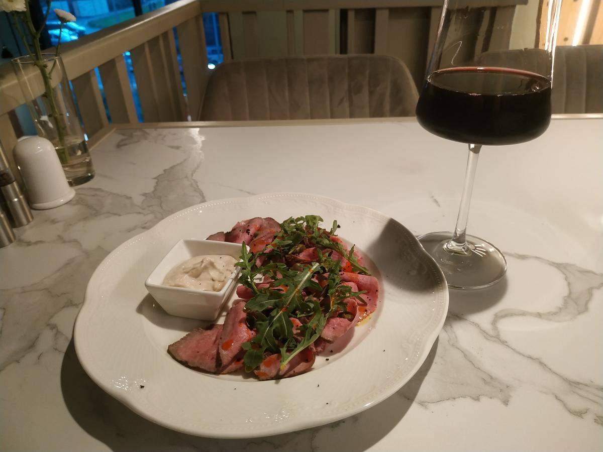 1) Вителло тоннато (620р) - средний. Недостаточно сочная телятина, в соусе, поданном отдельно, нет выраженного яркого вкуса тунца. Каперсы на месте. Сверху слегка полили бальзамическим соусом и оливковым маслом, почему-то красного цвета... сначала подумал это тот оливыч, что с перцем чили, но никакой остроты нет.