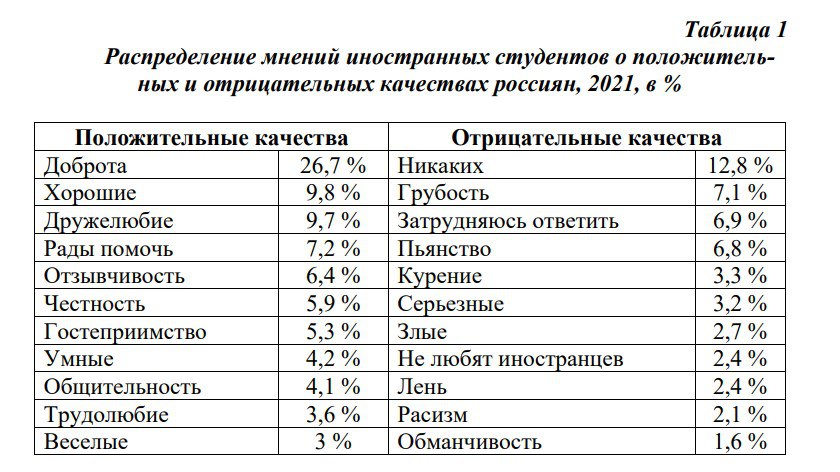 В 2021 году сотрудники Южно-российского филиала Института социологии РАН опросили о главных качествах россиян 1095 иностранных студентов, магистрантов и аспирантов, проходящих обучение в вузах Южного федерального округа («Известия ТулГУ. Гуманитарные науки», №3, 2024).