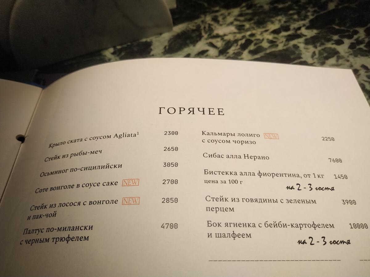 Меню 3-винная карта, барная и еда. Имеется не только рыба с морскими гадами, но и мясо: стейк, бок ягнёнка, карпаччо, тартар.