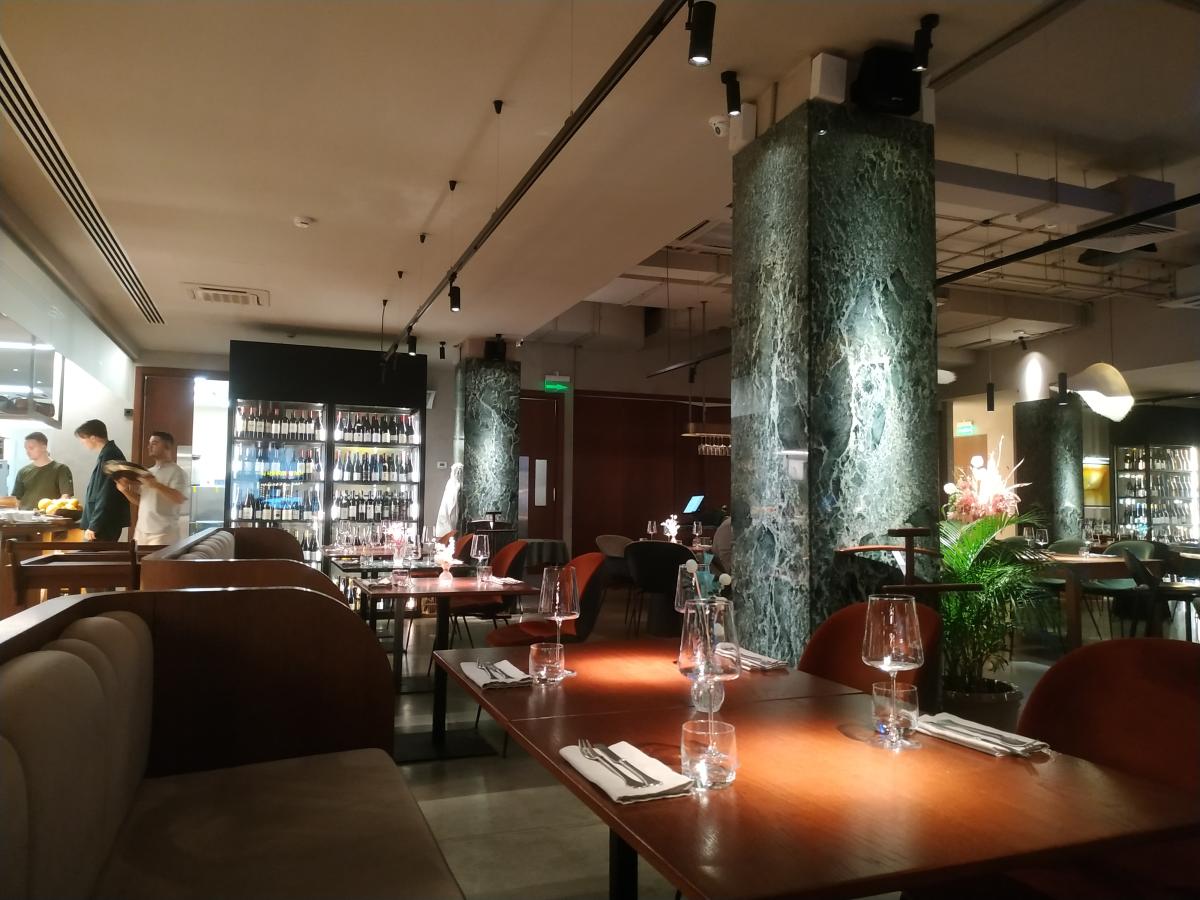 Будний день, первая половина. Посетителей почти нет. На входе собрался скучающий отряд хостесов, официантов, и какой-то дядя, помогающий запрятать тулуп в шкаф. Столы предлагают любые, столов много. Зал большой, оформлен соответствующе: прямоугольные колонны отделаны под мрамор в морском стиле, люстры в форме медуз, и, главное, посерёдке здоровенный колонна-аквариум от пола до потолка, с круговой стойкой, за которую можно засесть и медитировать, глядя на рыбов.