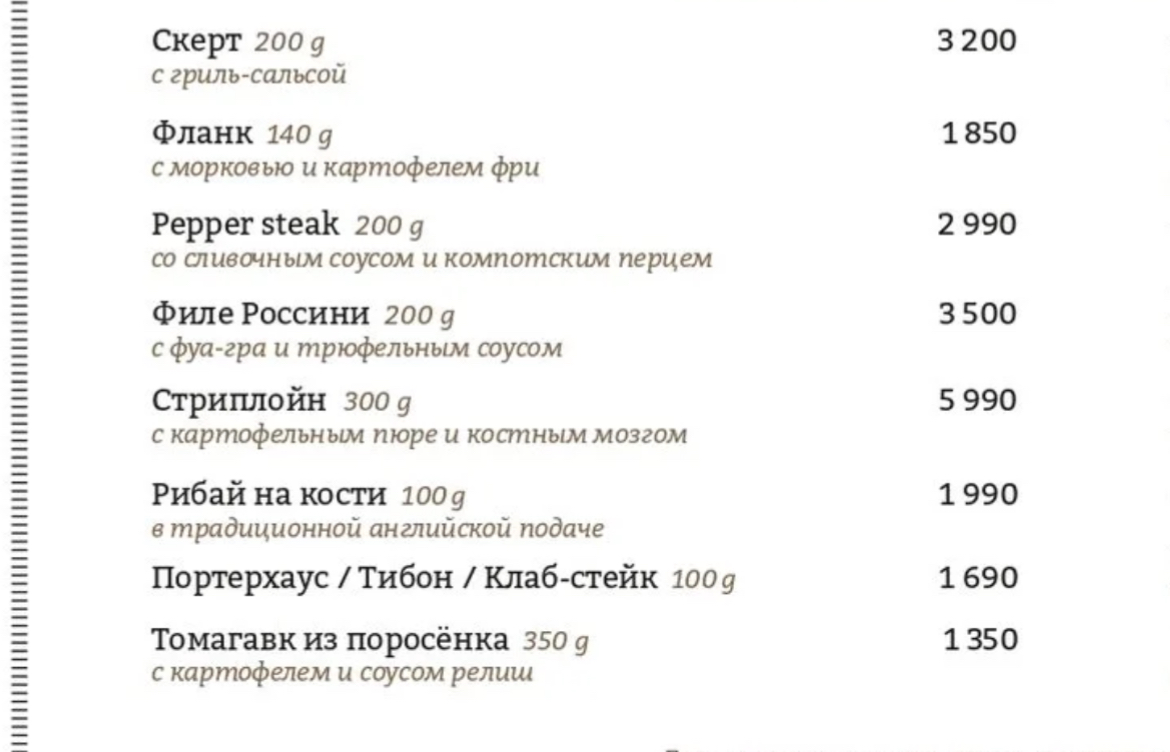 Ценник как в хороших рестораннов спб, за рибай итого дороже будет. Но мясо готовить умеют. Не три звезды мишлена, но если и пробовать что-то по мясу, то туда. Сервис на уровне, не туристическое место.