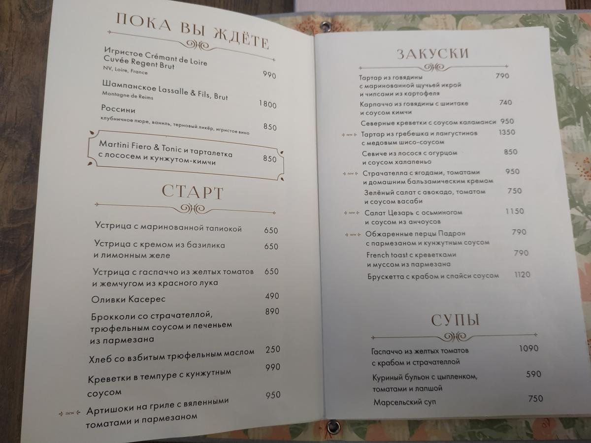 Камрад был в восторге от севиче из лосося с огурцом и соусом на основе халапеньо (850р) и от Марсельского супа с аргентинской креветкой, томатом и ромэном (750р). Картофельный гратен с белыми грибами и чёрным трюфелем не зашли...Себе брал: говяжью щёку с вешенками и сливочной полентой (990р), пасту казарече с крабом и пармезаном (1560р), карпачо с соусом кимчи (740р). Паста такое себе, остальное отлично.