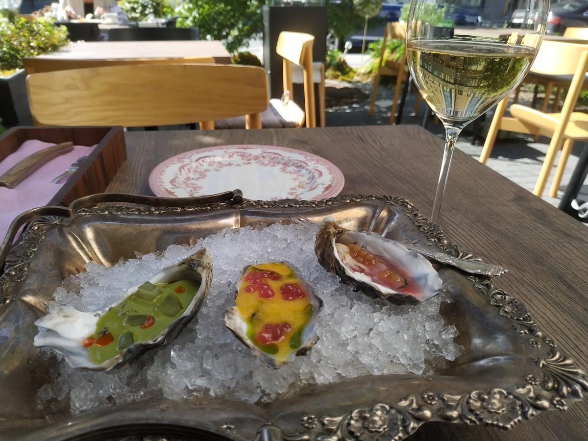 1) Три устрицы (650р/штука) - классических устриц нет, позиция мудрёная, устрицы чинёные всякой фсячиной. Первая с гаспаччо из жёлтых томатов и "жемчугом" из красного лука, вторая с маринованной тапиокой, третья с кремом из базилика и лимонным желе. На любителя короче.