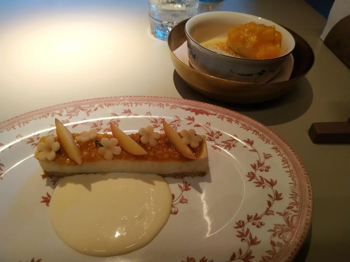 4) Десерт 1-клафути с ряженкой (590р) - десерт на сливочно-творожной основе с Бурбонский ванилью. Подают с дольками персика, марципаном в форме цветов и сладким соусом на основе ряженки.