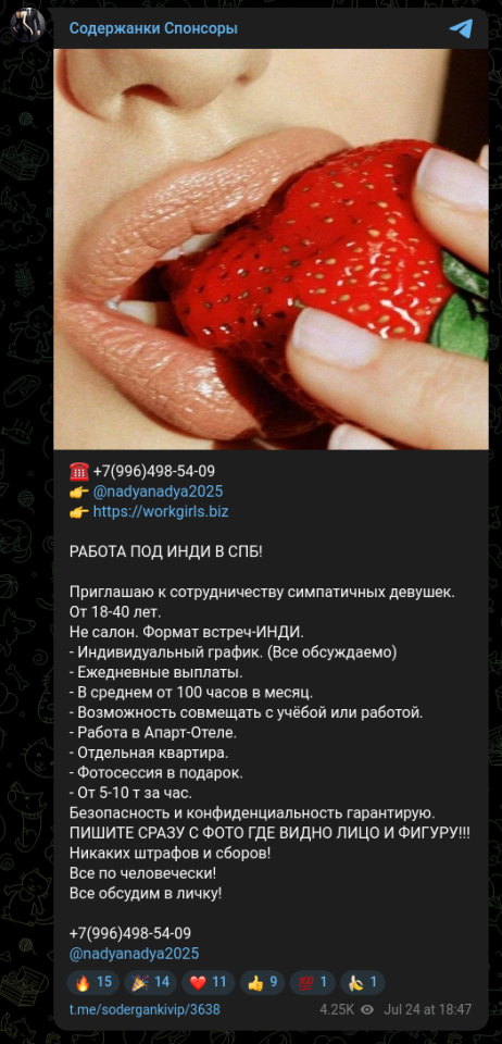По данному ТГ и номеру через яндексе бъётся приглашение девушек на работу.