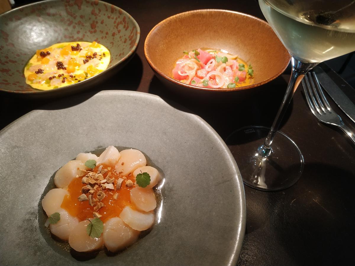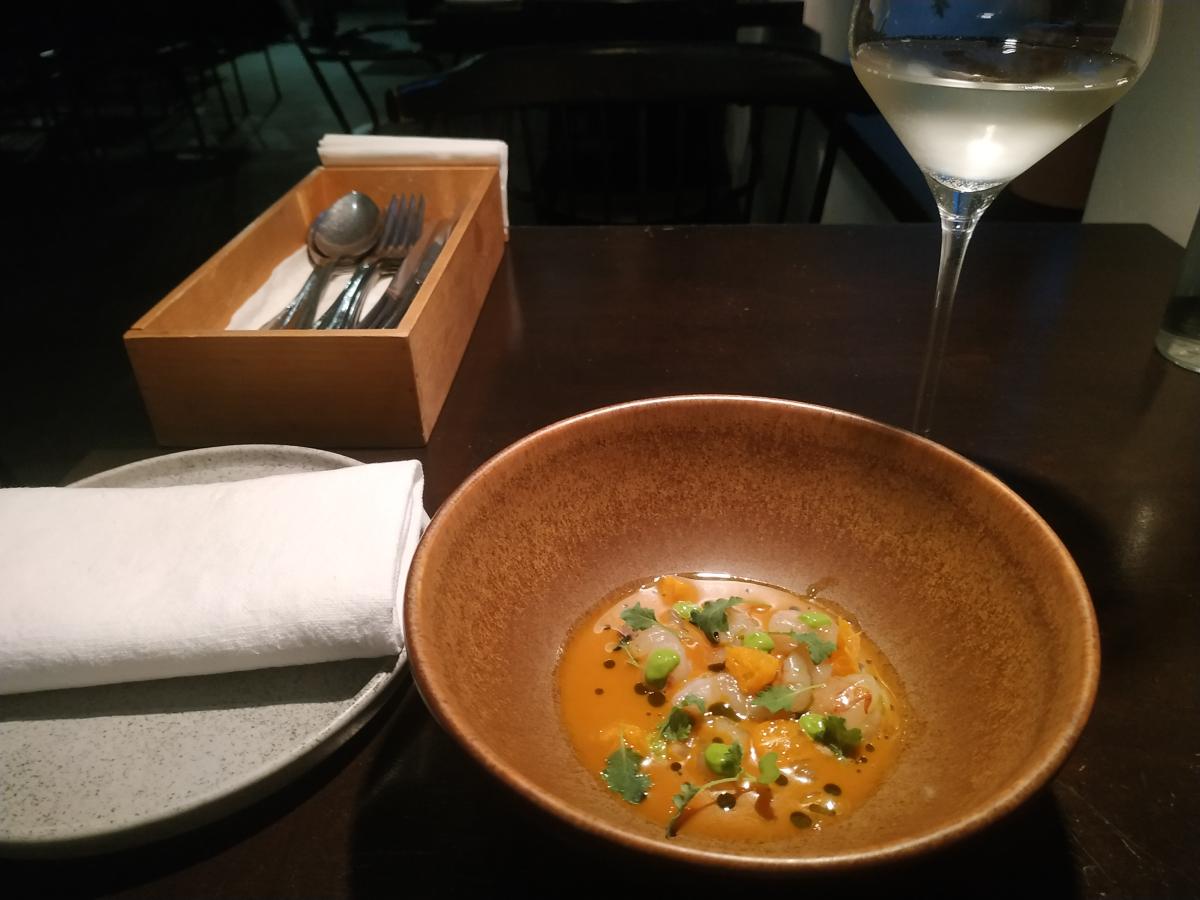 Креветка с мандарином и понзу (облепиховым), чисто такая восточная история. Дайкон, лайм, домашний ферментированный соевый соус. Подают с белым вином.