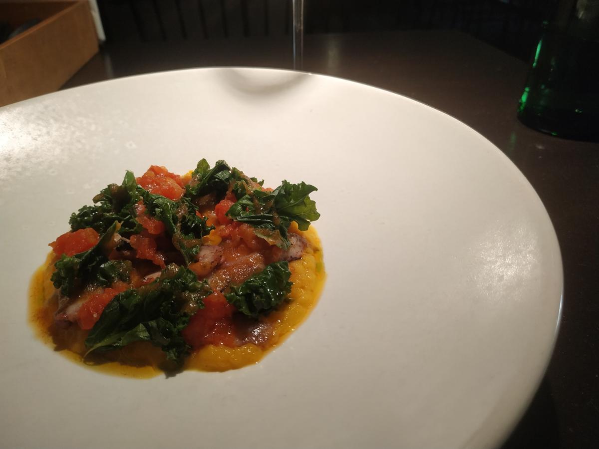 Далее - осьминог с тыквой (1190р) Самого осьминога там столовая ложка, остальное тыквенный крем и вяленые томаты