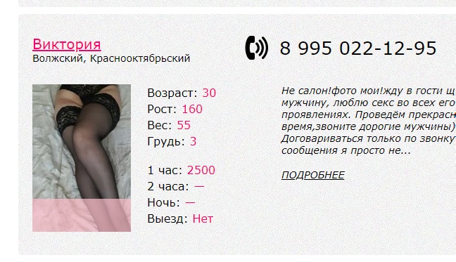 Ну, не так всё красиво как хотелось бы. Хотя бы и по части обновления/увеличения контента. Да три-четыре реальных анкеты. Одну подтверждаю на 100% поскольку был. Одну на 90-поскольку звонил и хочу побывать. Вот от посещения ̶с̶т̶р̶а̶ш̶н̶о̶й̶ Страстной блондинки что-то удерживает, и даже не пойму что и почему ?? хотя на анкету давно на сайте засматриваюсь. Никаких "малинок" и "кошечек" у нас в Волжском нет, и не бывало отродясь. А вот эти именно номера телефонов принадлежали многим анкетам, их в архивах сексоволга по 5-6 штук разных на один номер. ̶М̶е̶н̶я̶ ̶т̶е̶р̶з̶а̶ю̶т̶ ̶с̶м̶у̶т̶н̶ы̶е̶ ̶с̶о̶м̶н̶е̶н̶и̶я̶ впечатление создаётся, что за всем этим стои конкретная блядоконтора/рекрутерское агенство (как угодно можно называть).