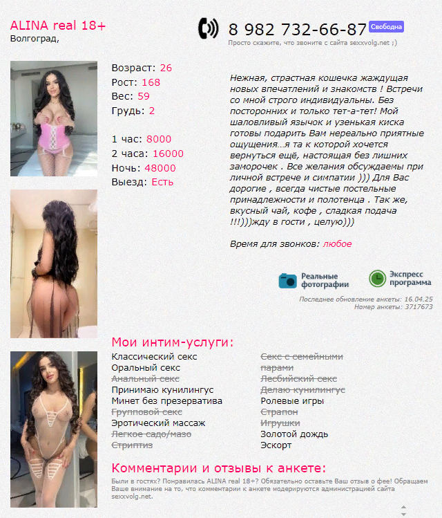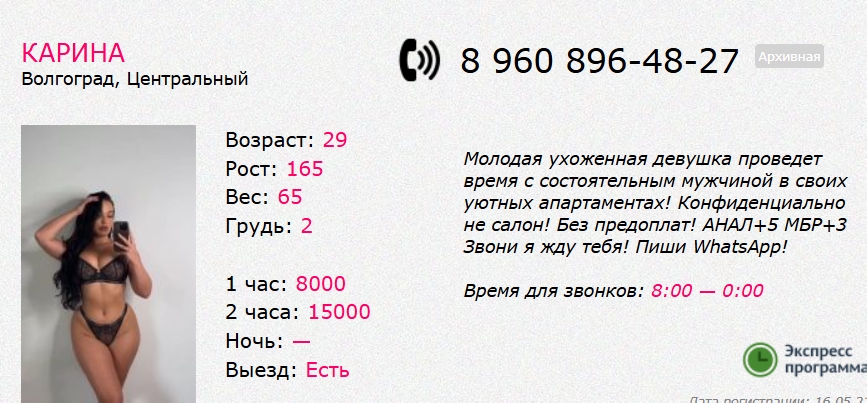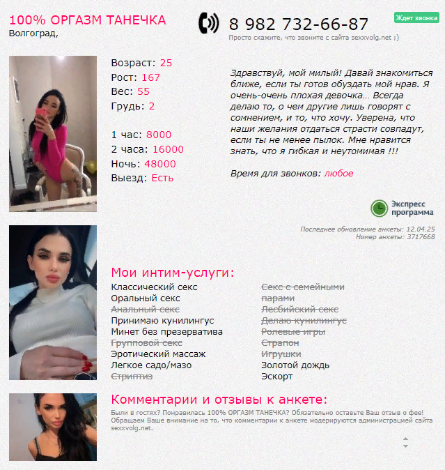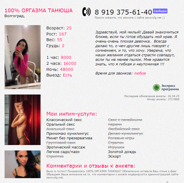 По порядку. Оказался в славном городе Волгограде, решил отметиться. С поиском платной любви жопа. В тг ничего не нашел. Есть более-менее центровой сайт (ссылка с него), но там все как когда-то у нас, по ходу: объявы в подавляющем большинстве фейковые, на кого нарвешься при встрече-лотерея. Ценник плавает от 3-4к до 12-15 плюс-минус.